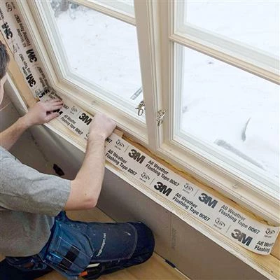 The 3M 8067 9 in. x 75 ft. All Weather Flashing Tape is a self-adhered, waterproof flashing membrane designed for sealing around openings and penetrations in exterior walls. This product has a unique acrylic pressure sensitive adhesive that aggressively sticks and stays stuck both at lower and higher application temperatures than traditional flashing tapes. It even adheres to damp surfaces.