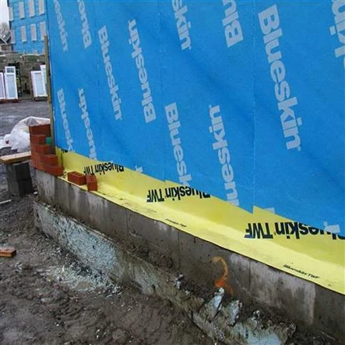Henry Bakor BH200TW934 18 in. x 75 ft. Blueskin TWF Self-Adhesive Thru-Wall and Dampproof Flashing Membrane consisting of an SBS rubberized asphalt compound, which is integrally laminated to a yellow cross-laminated polyethylene film. The membrane is specifically designed for use as a thru-wall flashing.