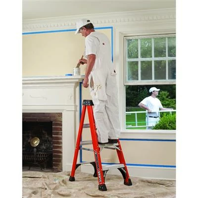 The LOUISVILLE FS1406HD Heavy Duty Orange Fiberglass Step Ladder with 375 lbs. Load Capacity Type IAA Duty Rating is made from non-conductive fibreglass. Equipped with Da Boot for slip resistant footing and the ProTop, a non- conductive structural molded top with hardware tray, paint can holder, handyman’s tool slots, pipe holder, curved front of top provides leg comfort and convenient magnet to secure small steel parts. The Louisville FS1406HD step ladder meets or exceeds the safety standards set by ANSI, CSA, and OSHA.