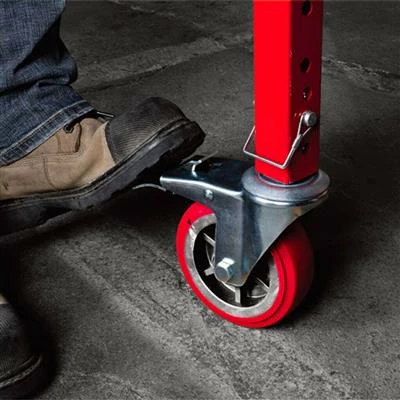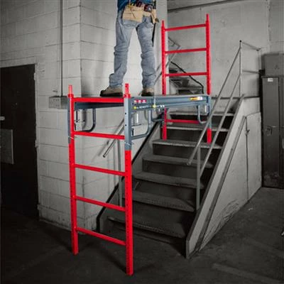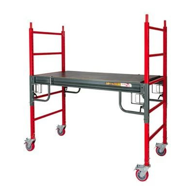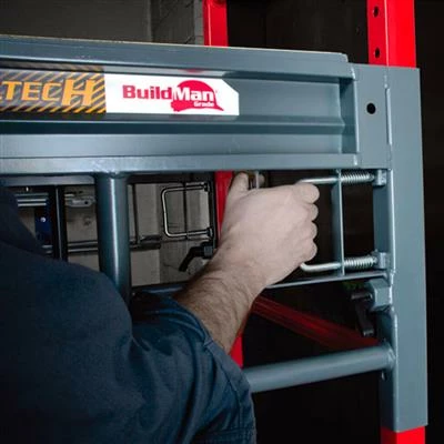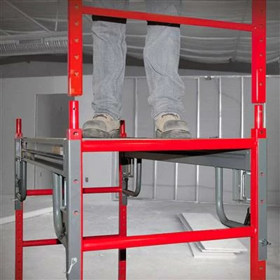 The MetalTech BuildMan I-BMSS 6 ft. Drywall Baker Style Utility Scaffold features an industry highest 1500 lb. rated capacity (tested at a 4:1 Safety Factor), rugged 1-3/4 inch square tube steel construction with a red and gray baked-on poly powder coat finish, 6 in. double locking heavy duty non-marking caster wheels and a full hand grip spring-loaded locking mechanism and additional tightening handle for increased stability. Steel reinforced fiberglass coated anti-slip plywood platform adjusts from 27-73 inches in 2 inch increments. At 29 inches wide, this unit will conveniently fit through standard door openings making it very portable to move from room to room. This Buildman grade Baker can even be used on stairways and is ideal for drywall and painting applications particularly those hard to reach high ceilings. Meets OSHA and CSA requirements.
