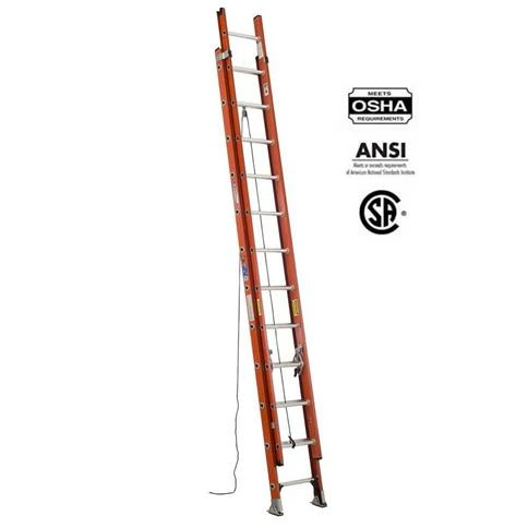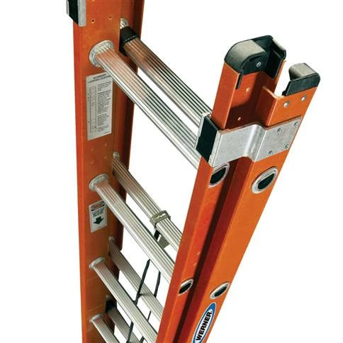 WERNER D6224-2CA 24 ft. Fibreglass D-Rung Multi-Section Extension Ladder with 300 lb. Load Capacity Type IA Duty Rating has non-conductive rails making this ladder ideal for working near electricity. With a duty rating of 300 pounds, the D6224-2CA is durable and long lasting. The exclusive ALFLO rung joint means TWIST-PROOF performance on the job. The TRACTION-TRED D-rungs are slip resistant and the side rails are interlocking. The dual action feet are for use on hard or penetrable surfaces and swivel easily. The base and fly sections separate easily to use the base section as a single ladder. The durable rail shield bracket and shoe help protect the bottom of the rail. The fly section rails are pre-pierced at the top for easy field installation of accessories.