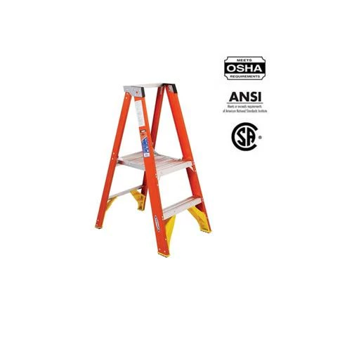 WERNER P6202CA 2 ft. Fibreglass Platform Step Ladder with 300 lb. Load Capacity Type IA Duty Rating is light and durable. Safety guard rail encourages proper ladder use. Large platform provides secure and comfortable work area. Back-up plates reinforce all top connectors. Full set of rear horizontals spaced one per foot. Double riveted, slip-resistant Traction-Tred steps. Wider stance for stability. Seven layer fibreglass construction.
